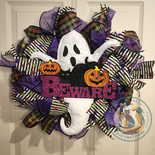 Don't let his gholish warning fool you. This adorable handmade deco mesh and ribbon wreath is perfect for welcoming all this Halloween season!