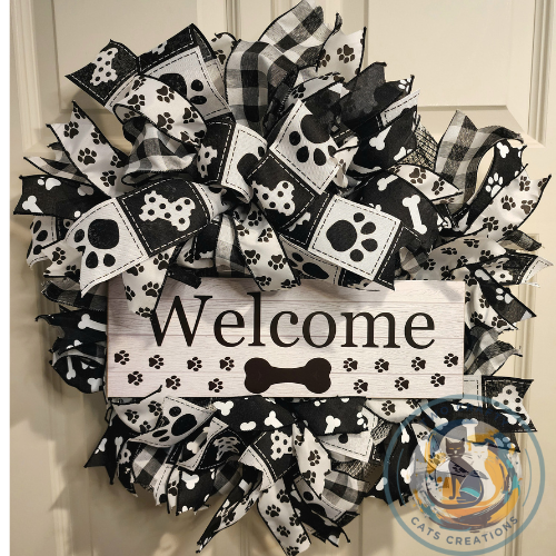 This adorable handmade deco mesh and ribbon wreath is the perfect way to welcome fellow dog lovers to your home!